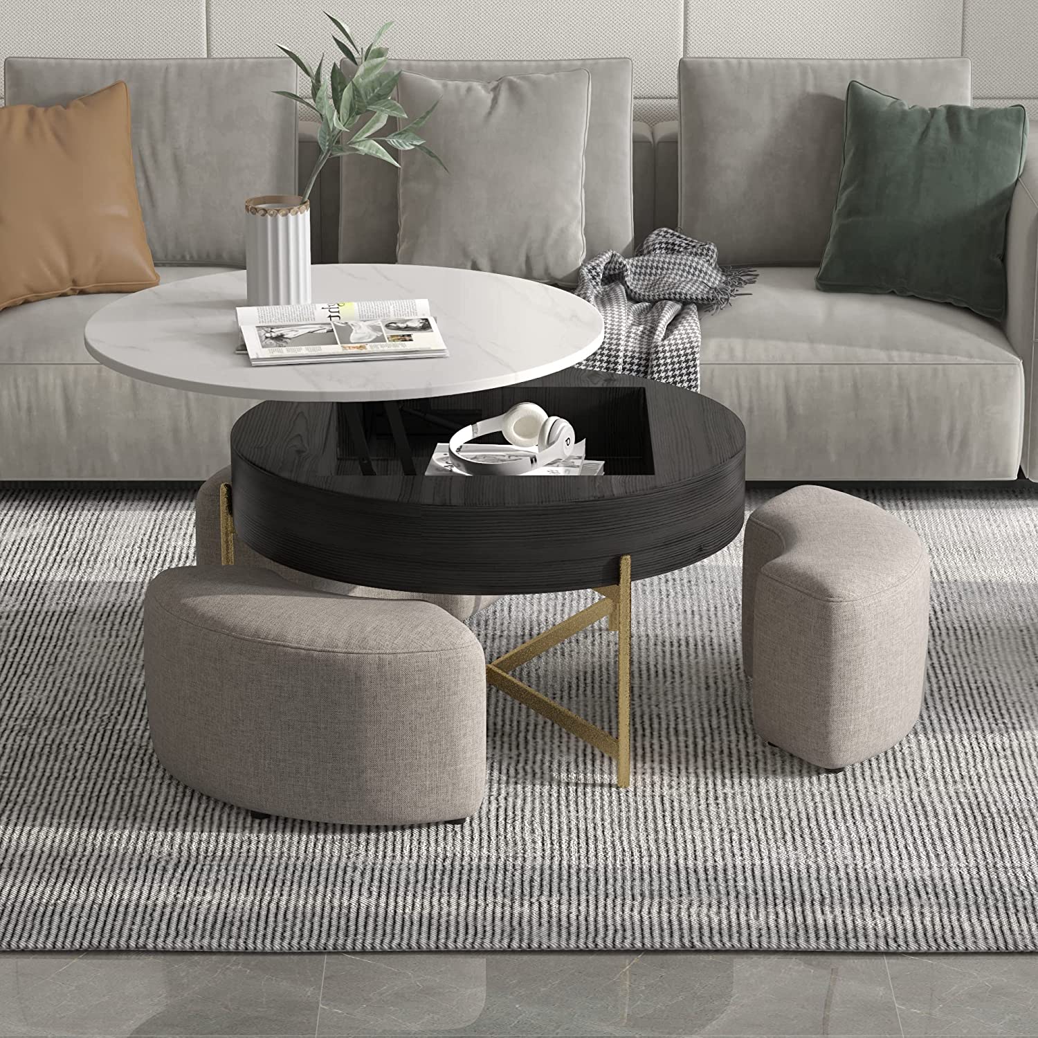 Elevate your entertainment game with the MGH Round Coffee Table - a must-have for any modern living space! Its lift-top design raises the table from 17.71'' to 24.6'', giving you ample space for your legs and comfortable support for your arms. Plus, it comes complete with three cozy stools that can be hidden away under the countertop when not in use!