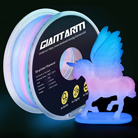 The GIANTARM Glow in The Dark Rainbow Luminous PLA Filament has an item diameter of 1.75 millimeters, and a net weight of 1 kilogram (2.2 lbs), allowing for quick and accurate printing with no bubbles, clogging or drawing so your prints are looking their best every time, plus it boasts superior toughness and durability compared to other filaments on the market as well as a low level of moisture that prevents nozzle clogging for consistent performance.