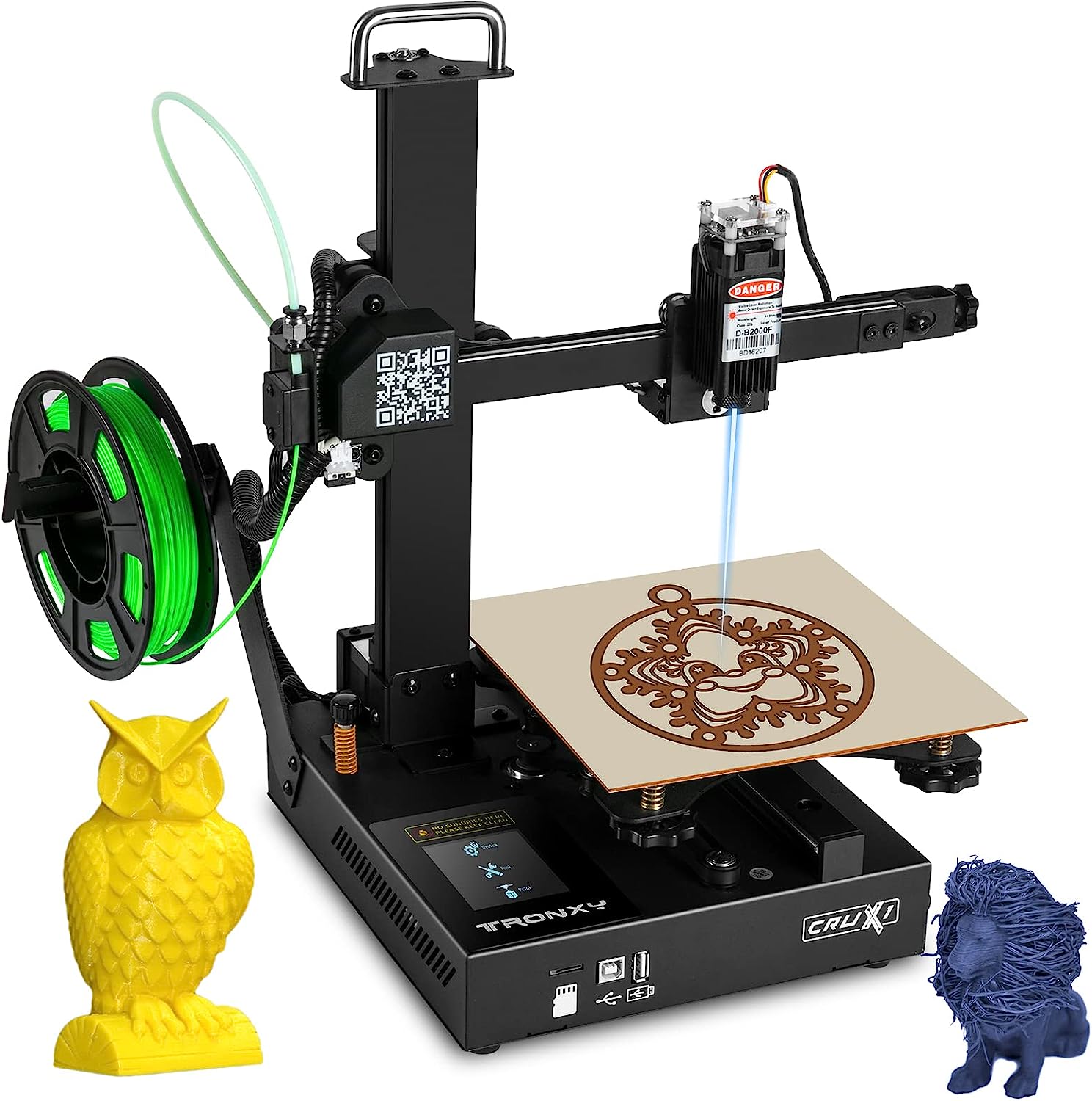 The ULTRABOT Mini 2-in-1 Laser 3D Printer combines the advantages of both 3D printing and laser engraving, making it an excellent choice for professionals, hobbyists, and beginners alike. It features an intuitive 2.8 inch touchscreen LCD display for easy use; a built-in power supply for enhanced safety; large rotary knobs for easier leveling; wide compatibility with Windows, Mac OS, and Linux systems; filament sensor that stops working in case of accident like filament breakage.